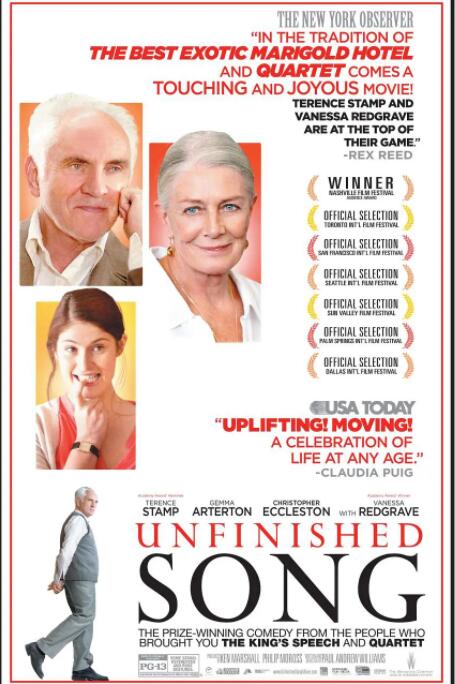 亚瑟(特伦斯·斯坦普 Terence Stamp 饰)的妻子玛丽昂(瓦妮莎·雷德格瑞夫 Vanessa Redgrave 饰)虽然身患绝症,却一直坚持参加小镇上的老年合唱团。这个由年轻音乐教师伊丽莎白(杰玛·阿特登 Gemma Arterton 饰)在工作之余组织起来的合唱团不仅是镇上老年人们消磨时光的好去处,更为他们结交新朋友提供了机会。可是固执的亚瑟并不支持也不理解玛丽昂唱歌,他只希望爱妻可以安心在家养病。但亚瑟终归执拗不过玛丽昂,即使在生命最后的时光里,玛丽昂也如愿参加了合唱比赛。小镇的老年合唱团通过了比赛的初赛,玛丽昂在赛后安详去世。虽然伊丽莎白和其他老人都想帮助亚瑟走出悲伤,但倔强的亚瑟不仅将他们拒之千里之外,甚至对亲生儿子詹姆斯(克里斯托弗·埃克莱斯顿 Christopher Eccleston 饰)都恶言相加。亚瑟本打算将自己永久关闭在失去爱妻的悲痛之中,但几次与伊丽莎白意外的对话让他慢慢理解了玛丽昂生前对合唱团热爱的原因,也开始反思自己与儿子之间的关系。渐渐的,亚瑟好像敞开了心扉。他决心为了去世的玛丽昂开始迎接新生活。©豆瓣
